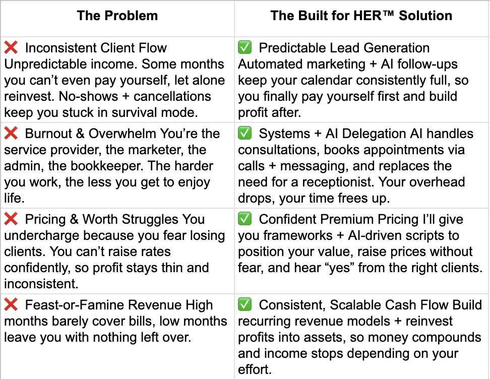 Built for HER™ is designed to help you build or restructure your business the right way from the start, with automation, systems, and strategy that set you up for scalable income and long-term success.